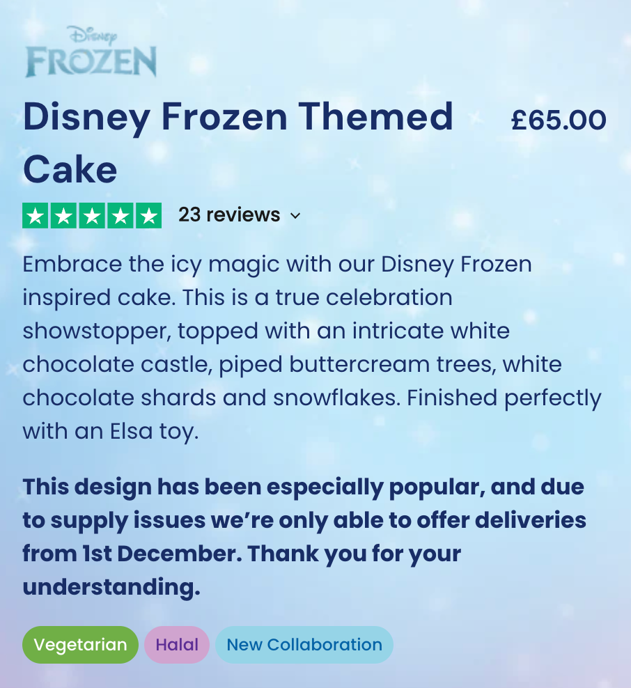 We’re currently having a supply issue with the castles which affects our Disney Themed Frozen Cakes. These cakes have been blocked off for orders.